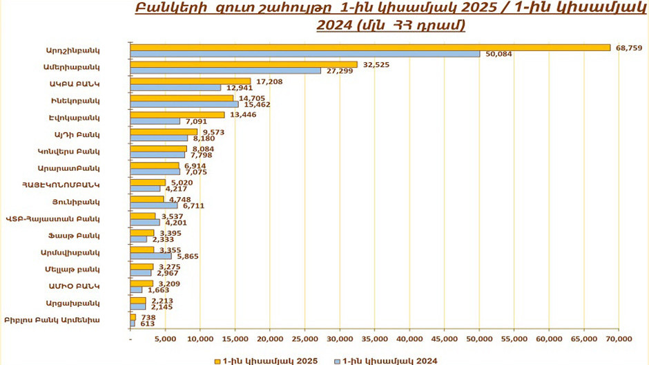 Ձեր ուշադրությանն ենք ներկայացնում «Հայաստանի բանկային համակարգի արդյունքների ամփոփում» RUMELS Management Solutions մասնագիտացված խորհրդատվական ընկերության հերթական վերլուծությունը, որը հրապարակվում է Banks.am կայքում բացառիկ հիմունքներով:Վերջին 25 տարիների ընթացքում Ռուբեն Մելիքյանը զբաղեցրել է պատասխանատու ղեկավար պաշտոններ տարբեր ոլորտներում գործող ընկերություններում՝ ձեռք բերելով փորձառություն տնտեսության բազմապիսի ճյուղերում՝ ներքին եւ արտաքին աուդիտ, մանրածախ ու մեծածախ առեւտուր եւ բանկային համակարգ: Ռուբեն Մելիքյանը ACCA-ի լիակատար անդամ է, Oxford-ի համալսարանի շրջանավարտ (Executive MBA), ինչպես նաեւ ստացել է New York-ի համալսարանի «Բիզնեսի խորացված գնահատում» մասնագիտացման հավաստագիր (Certificate on Advanced Corporate Valuation)։Սույն հետազոտության նպատակն է վերլուծել Հայաստանի բանկային համակարգի հիմնական ֆինանսական ցուցանիշները՝ 2025 թ. 1-ին կիսամյակի համար:Զուտ շահույթ 2025 թվականի 1-ին կիսամյակի ընթացքում Հայաստանում գործող բանկերի ընդհանուր զուտ շահույթը կազմում է 200,7 մլրդ ՀՀ դրամ, ինչը 29 մլրդ ՀՀ դրամով կամ 16,6%-ով ավել է, քան 2024 թվականի նույն ժամանակաշրջանում գրանցած արդյունքը։ Նշված ժամանակաշրջանում բոլոր բանկերը գրանցել են շահույթ:Ամենամեծ շահույթն արձանագրել է Արդշինբանկ-ը շուրջ 68,8 մլրդ ՀՀ դրամով։ Արդշինբանկը նաեւ առաջատարն է ըստ ընդհանուր ակտիվների։ Լուսանկարը՝ RUMELS Management Solutions Վարկային պորտֆելԲանկային համակարգի ընդհանուր վարկային պորտֆելը 2025 թվականի 1-ին կիսամյակի ընթացքում աճել է 10,3%-ով։Առ 30.06.2025թ. ընդհանուր վարկային պորտֆելը հավասար է 6.925 մլրդ ՀՀ դրամի եւ կազմում է ընդհանուր ակտիվների 60%-ը։Նշված ընդհանուր վարկային պորտֆելը ներառում է մանրածախ եւ կորպորատիվ վարկեր։ Լուսանկարը՝ RUMELS Management Solutions Ամենախոշոր 5 բանկերի (Ամերիաբանկ, Արդշինբանկ, Ակբա բանկ, Ամիօ բանկ եւ Ինեկոբանկ) ընդհանուր վարկային պորտֆելները կազմում են բանկային համակարգի ընդհանուր վարկային պորտֆելի 64,4%-ը:Ամերիաբանկի մասնաբաժինը ամենամեծն է՝ 21,1%: Լուսանկարը՝ RUMELS Management Solutions ՊարտատոմսերԲանկային համակարգի կողմից թողարկված պարտատոմսերի մնացորդը 2025 թվականի 1-ին կիսամյակի ընթացքում նվազել է 42 մլրդ ՀՀ դրամով, կամ 8%-ով։ Առ 30.06.2025թ. բանկային համակարգի կողմից թողարկված պարտատոմսերի մնացորդը կազմում է շուրջ 466 մլրդ ՀՀ դրամ։17 գործող բանկից պարտատոմսեր թողարկել է 13-ը։ Լուսանկարը՝ RUMELS Management Solutions Ընդհանուր կապիտալ2025 թվականի 1-ին կիսամյակի ընթացքում Հայաստանի բանկային համակարգի ընդհանուր կապիտալն աճել է 183 մլրդ ՀՀ դրամով, կամ 10%-ով ու կազմել 1.960 մլրդ ՀՀ դրամ։ Այս ավելացումը հիմնականում պայմանավորված է գրանցված զուտ շահույթով՝ 200,7 մլրդ ՀՀ դրամ, Ամիօ բանկի կանոնադրական կապիտալի աճով՝ 20 մլրդ ՀՀ դրամ եւ վճարված դիվիդենտներով:2025 թվականի 1-ին կիսամյակի ընթացքում՝ 8 բանկ վճարել է դիվիդենտներ ընդհանուր 136,4 մլրդ ՀՀ դրամ։- Արդշինբանկ՝ 103 մլրդ ՀՀ դրամ (որից 97,5 մլրդ ՀՀ դրամ ուղղվել է կանոնադրական կապիտալի ավելացմանը՝ սովորական եւ արտոնյալ բաժնետոմսերի տեսքով)- Ինեկոբանկ՝ 8 մլրդ ՀՀ դրամ- IDBank՝ 7 մլրդ ՀՀ դրամ- Ակբա բանկ՝ 6,6 մլրդ ՀՀ դրամ- Կոնվերս Բանկ՝ 4,3 մլրդ ՀՀ դրամ- ԱրարատԲանկ՝ 4 մլրդ ՀՀ դրամ- Evocabank՝ 2,5 մլրդ ՀՀ դրամ- Հայէկոնոմբանկ՝ 1 մլրդ ՀՀ դրամ Լուսանկարը՝ RUMELS Management Solutions 2025թ. 1-ին կիսամյակի եւ նախորդ ժամանակահատվածների համար ՀՀ բանկային համակարգի արդյունքների ամբողջական վերլուծությունները հասանելի են այս հղումով: Tweet Դիտում՝ 11962