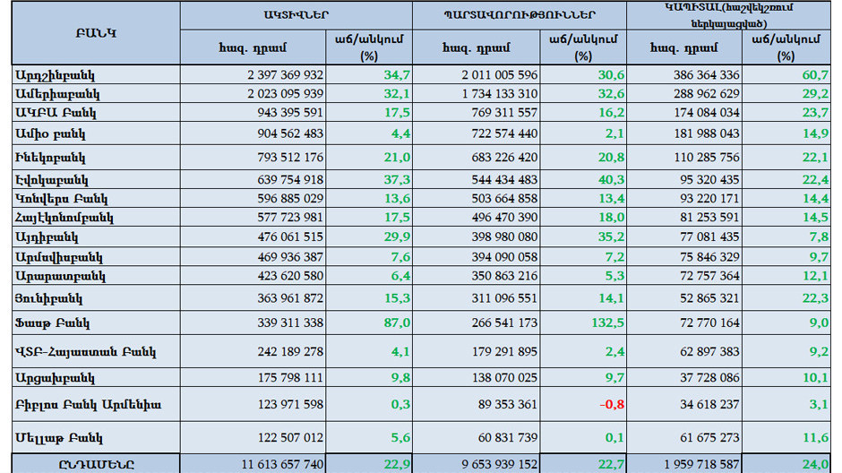 Հայաստանյան բանկերը 2025թ․ առաջին կիսամյակի ընթացքում արձանագրել են աճ հիմնական հաշվեկշռային ցուցանիշների ուղղությամբ 2024թ. նույն ժամանակահատվածի համեմատ:Բանկային համակարգի ընդհանուր ակտիվներն ավելացել են 22.9%-ով, պարտավորությունները՝ 22.7%-ով, կապիտալը՝ 24%-ով:Ուսումնասիրելով ՀՀ առեւտրային բանկերի հրապարակած միջանկյալ ֆինանսական հաշվետվությունները՝ Banks.am-ը ներկայացնում է 2025թ․ առաջին կիսամյակում բանկային հատվածի հիմնական ֆինանսական ցուցանիշների վերլուծությունը:ԱկտիվներՀՀ բանկային համակարգի ակտիվների ընդհանուր ծավալը 2025 թվականի առաջին կիսամյակում 2024 թվականի նույն ժամանակահատվածի համեմատ աճել է 22.9%-ով՝ կազմելով 11 613.66 մլրդ դրամ:Ակտիվների մեծությամբ առաջատարն Արդշինբանկն է, որը 2024թ. նույն ժամանակահատվածի համեմատ արձանագրել է ցուցանիշի 34․7% աճ: Հաշվետու ժամանակահատվածում բանկի ակտիվները կազմել են 2 397.37 մլրդ դրամ:Արդշինբանկին ակտիվների մեծությամբ հաջորդում է Ամերիաբանկն՝ արձանագրելով 32.1% աճ եւ հասնելով 2 023.1 մլրդ դրամ ցուցանիշի:Առաջատար հնգյակում են նաեւ Ակբա բանկը 943.4 մլրդ դրամ (17.5% աճ), Ամիօ բանկը՝ 904.56 մլրդ դրամ (4․4% աճ) եւ Ինեկոբանկը 793.51 մլրդ դրամ (21% աճ) ցուցանիշներով:ՊարտավորություններԲանկային համակարգի պարտավորությունների ընդհանուր ծավալը 2025 թվականի առաջին կիսամյակում 2024 թվականի նույն ժամանակահատվածի համեմատ ավելացել է 22.7%-ով՝ կազմելով 9 653.94 մլրդ դրամ:Պարտավորությունների մեծությամբ առաջատարն Արդշինբանկն է: Բանկի պարտավորությունները 2025թ. առաջին կիսամյակում աճել են 30.6%-ով՝ կազմելով 2 011.01 մլրդ դրամ:Երկրորդն ըստ պարտավորությունների Ամերիաբանկն է՝ 1 734.13 մլրդ դրամ ցուցանիշով արձանագրելով 32․6% աճ: Վերջիններին հաջորդում են Ակբա բանկը՝ 769.31 մլրդ դրամ (16․2% աճ), Ամիօ բանկը՝ 722.57 մլրդ դրամ (2.1% աճ) եւ Ինեկոբանկը՝ 683.23 մլրդ դրամ (20․8% աճ):ԿապիտալՀաշվետու ժամանակահատվածում ՀՀ բանկային համակարգում կապիտալի աճը կազմել է 24%, ինչի արդյունքում արձանագրվել է 1 959.72 մլրդ դրամ ցուցանիշ:Կապիտալի մեծությամբ առաջատարը կրկին Արդշինբանկն է՝ 386.36 մլրդ դրամ ցուցանիշով: Նախորդ տարվա նույն ժամանակահատվածի համեմատ աճը կազմել է 60.7%։Երկրորդը Ամերիաբանկն է՝ 288.96 մլրդ դրամ ցուցանիշով, բանկի կապիտալի աճը կազմել է 29․2%:Կապիտալի մեծությամբ մյուս առաջատարներն են Ամիօ բանկը՝ 181.99 մլրդ դրամ (14.9% աճ), Ակբա բանկը՝ 174.08 մլրդ դրամ (23․7% աճ), իսկ առաջատար հնգյակը եզրափակում է Ինեկոբանկը, որն արձանագրել է 110.29 մլրդ դրամի ցուցանիշ՝ կապիտալի 22.1% աճով:Նշվում է, որ 2025թ. առաջին կիսամյակում առաջատար հինգ բանկերին բաժին է ընկել համակարգի ակտիվների 60.8%-ը, պարտավորությունների 61.3%-ը եւ կապիտալի 58.2%-ը:Ստորեւ բերված աղյուսակում ներկայացված են ՀՀ առեւտրային բանկերի հիմնական ֆինանսական ցուցանիշները՝ 2025թ. առաջին կիսամյակի դրությամբ: Ցուցանիշների աճը/անկումը հաշվարկված է 2024թ. նույն ժամանակահատվածի նկատմամբ:Բանկերը դասավորված են ըստ ակտիվների մեծության՝ ամենամեծից ամենափոքրը: Աննա Այվազյան Tweet Դիտում՝ 5159
