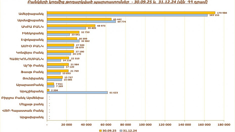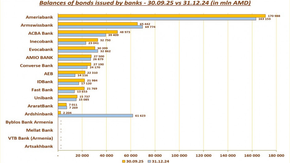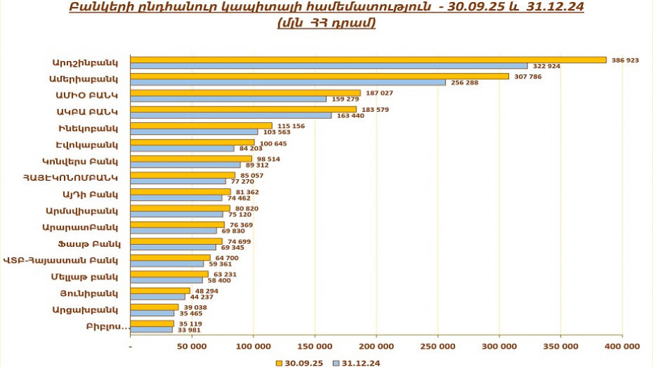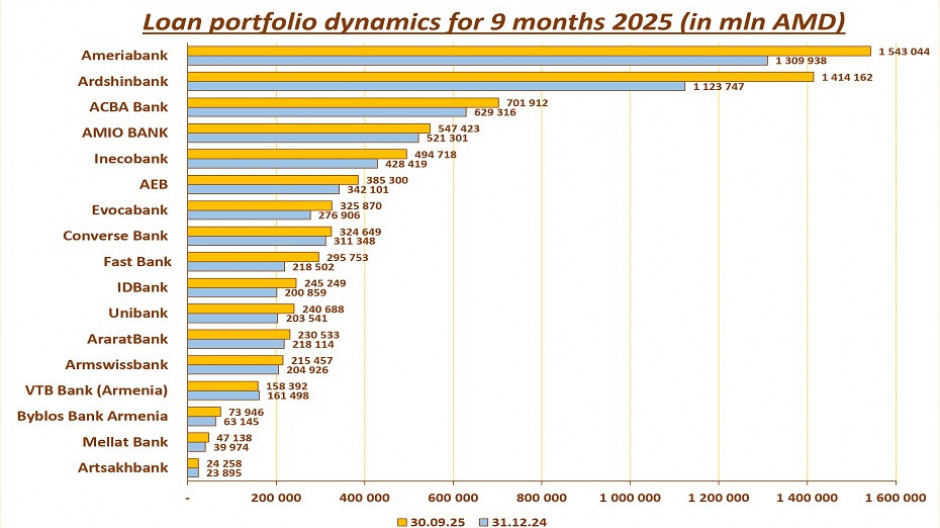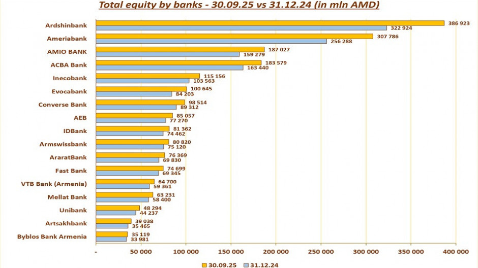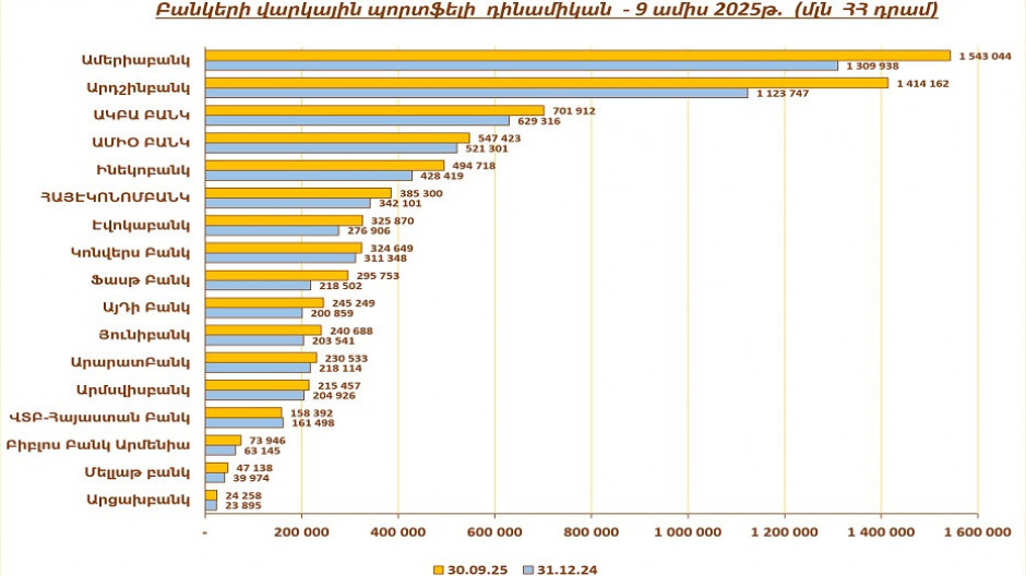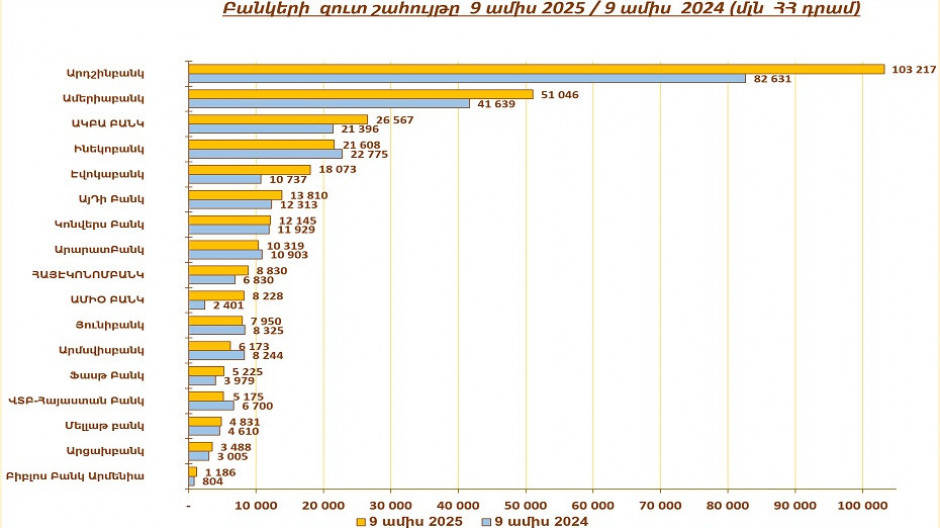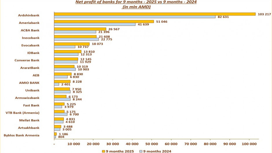 Ձեր ուշադրությանն ենք ներկայացնում «Հայաստանի բանկային համակարգի արդյունքների ամփոփում» RUMELS Management Solutions մասնագիտացված խորհրդատվական ընկերության հերթական վերլուծությունը, որը հրապարակվում է Banks.am կայքում բացառիկ հիմունքներով:Վերջին 25 տարիների ընթացքում Ռուբեն Մելիքյանը զբաղեցրել է պատասխանատու ղեկավար պաշտոններ տարբեր ոլորտներում գործող ընկերություններում՝ ձեռք բերելով փորձառություն տնտեսության բազմապիսի ճյուղերում՝ ներքին եւ արտաքին աուդիտ, մանրածախ ու մեծածախ առեւտուր եւ բանկային համակարգ: Ռուբեն Մելիքյանը ACCA-ի լիակատար անդամ է, Oxford-ի համալսարանի շրջանավարտ (Executive MBA), ինչպես նաեւ ստացել է New York-ի համալսարանի «Բիզնեսի խորացված գնահատում» մասնագիտացման հավաստագիր (Certificate on Advanced Corporate Valuation)։Սույն հետազոտության նպատակն է վերլուծել Հայաստանի բանկային համակարգի հիմնական ֆինանսական ցուցանիշները՝ 2025 թվականի 9 ամիսների համար:Զուտ շահույթ 2025 թվականի 9 ամիսների ընթացքում Հայաստանում գործող բանկերի ընդհանուր զուտ շահույթը կազմում է 308 մլրդ ՀՀ դրամ, ինչը 49 մլրդ ՀՀ դրամով կամ 15%-ով ավելի է, քան 2024 թվականի նույն ժամանակաշրջանում գրանցած արդյունքը։ Նշված ժամանակաշրջանում բոլոր բանկերը գրանցել են շահույթ:Ամենամեծ շահույթն արձանագրել է Արդշինբանկը՝ շուրջ 103 մլրդ ՀՀ դրամ։ Արդշինբանկը նաեւ առաջատարն է ըստ ընդհանուր ակտիվների։ Վարկային պորտֆելԲանկային համակարգի ընդհանուր վարկային պորտֆելը 2025 թվականի 9 ամիսների ընթացքում աճել է 15,8%-ով։Առ 30.09.2025թ. ընդհանուր վարկային պորտֆելը հավասար է 7.268 մլրդ ՀՀ դրամի եւ կազմում է ընդհանուր ակտիվների 61%-ը։Նշված ընդհանուր վարկային պորտֆելը ներառում է մանրածախ եւ կորպորատիվ վարկեր։ Ամենախոշոր 5 բանկերի (Ամերիաբանկ, Արդշինբանկ, Ակբա բանկ, Ամիօ բանկ եւ Ինեկոբանկ) ընդհանուր վարկային պորտֆելները կազմում են բանկային համակարգի ընդհանուր վարկային պորտֆելի 64,7%-ը:Ամերիաբանկի մասնաբաժինը ամենամեծն է՝ 21,2%: ՊարտատոմսերԲանկային համակարգի կողմից թողարկված պարտատոմսերի մնացորդը 2025 թվականի 9 ամիսների ընթացքում նվազել է 14 մլրդ ՀՀ դրամով, կամ 2,7%-ով։ Առ 30.09.2025թ. բանկային համակարգի կողմից թողարկված պարտատոմսերի մնացորդը կազմում է շուրջ 494 մլրդ ՀՀ դրամ։17 գործող բանկից պարտատոմսեր թողարկել է 13-ը։ Ընդհանուր կապիտալ2025 թվականի 9 ամիսների ընթացքում Հայաստանի բանկային համակարգի ընդհանուր կապիտալն աճել է 251 մլրդ ՀՀ դրամով, կամ 14,2%-ով ու կազմել 2.028 մլրդ ՀՀ դրամ։ Նշված ժամանակահատվածում հետեւյալ բանկերն ավելացրել են կանոնադրական կապիտալը ընդհանուր 138,5 մլրդ ՀՀ դրամով.- Արդշինբանկ՝ 97,5 մլրդ ՀՀ դրամ- Ամիօ բանկ՝ 20 մլրդ ՀՀ դրամ- IDBank՝ 17 մլրդ ՀՀ դրամ - Յունիբանկ՝ 3,9 մլրդ ՀՀ դրամ2025 թվականի 9 ամիսների ընթացքում 9 բանկ վճարել է դիվիդենտներ՝ ընդհանուր 182 մլրդ ՀՀ դրամ։- Արդշինբանկ՝ 138 մլրդ ՀՀ դրամ (որից 97,5 մլրդ ՀՀ դրամ ուղղվել է կանոնադրական կապիտալի ավելացմանը՝ սովորական եւ արտոնյալ բաժնետոմսերի տեսքով)- Ինեկոբանկ՝ 10 մլրդ ՀՀ դրամ- Յունիբանկ՝ 7,8 մլրդ ՀՀ դրամ- IDBank ՝ 7 մլրդ ՀՀ դրամ - Ակբա բանկ՝ 6,6 մլրդ ՀՀ դրամ- Կոնվերս Բանկ՝ 4,3 մլրդ ՀՀ դրամ- ԱրարատԲանկ՝ 4 մլրդ ՀՀ դրամ- Evocabank՝ 2,5 մլրդ ՀՀ դրամ- Հայէկոնոմբանկ՝ 1,3 մլրդ ՀՀ դրամ 2025թ. 9 ամիսների եւ նախորդ ժամանակահատվածների համար ՀՀ բանկային համակարգի արդյունքների ամբողջական վերլուծությունները հասանելի են այս հղումով: Tweet Դիտում՝ 6384