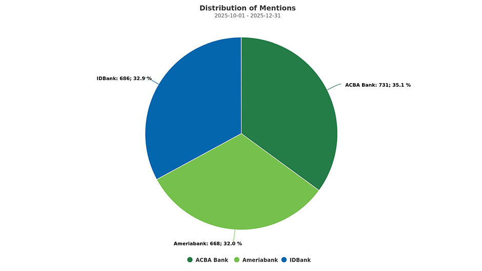 Banks.am կայքը, հիմնվելով Մեդիամաքս մեդիա ընկերության MaxMonitor մեդիա մոնիտորինգի համակարգի տվյալների վրա, ներկայացնում է «ՀՀ բանկերը ԶԼՄ-ներում» եռամսյակային համառոտ հաշվետվությունը:2025թ. չորրորդ եռամսյակի արդյունքներով՝ ԶԼՄ-ներում (լրատվական կայքեր, թերթեր եւ հեռուստաընկերությունների լրատվական հաղորդումներ) ունեցած հիշատակումների թվով առաջատար է Ակբա բանկը (731 հիշատակում), որին հաջորդում են IDBank-ը (686 հիշատակում) եւ Ամերիաբանկը (668 հիշատակում): IV եռամսյակում լրատվական կայքերում առաջատար է Ակբա բանկը ՝ 716 հիշատակում, թերթերում Արդշինբանկը՝ 26 հոդված, իսկ հեռուստատեսությամբ ԱրարատԲանկը՝ 9 ռեպորտաժ: Դրական հիշատակումների թվով առաջատար է IDBank-ը՝ 619 հիշատակում, երկրորդն այս ցուցանիշով Ֆասթ բանկն է՝ 608 հիշատակում, երրորդը Ակբա բանկը՝ 606 հիշատակում:Հիշատակումների ընդհանուր քանակում դրական հիշատակումների տոկոսային հարաբերակցությամբ առաջատար է Ֆասթ բանկը՝ 97,6 %, 608 դրական հիշատակում 623-ից: Երկրորդն այս ցուցանիշով ԱրարատԲանկն է՝ 97,5 %, 459 դրական հիշատակում 471-ից, երրորդը՝ IDBank-ն է՝ 90,2 %, 619 դրական հիշատակում 686-ից: 15.12.2025 | 00:11 «MaxMonitor-ը եղել եւ մնում է Հայաստանի շուկայի առաջատարը» Մեդիամաքսը ԶԼՄ-ների մոնիտորինգով զբաղվում է 2001-ից: Հայաստանյան բանկերին վերաբերող մոնիտորինգային ծառայությունը գործարկել է 2009թ., 2015թ. կեսից այն իրականացվում է MaxMonitor համակարգի միջոցով: Համակարգը, որում ներառված են ՀՀ բոլոր առեւտրային բանկերը, բաղկացած է երկու բաժնից` Մոնիտորինգ եւ Վերլուծություն: Օնլայն նորությունների բազան թարմացվում է յուրաքանչուր 15 րոպեն մեկ:Բանկային մոնիտորինգի դեպքում դիտարկվում են բոլոր հայկական լրատվական կայքերը (մոտ 150 կայքեր), թերթեր (մոտ մեկ տասնյակ անվանում) եւ հեռուստաընկերությունների լրատվական հաղորդումներ (9 անվանում): Մեդիամաքսը միակ ընկերությունն է Հայաստանում, որն անդամակցում է FIBEP-ին` մեդիամոնիտորինգային ընկերությունների միջազգային ֆեդերացիային, եւ առաջարկում միջազգային չափանիշներին համապատասխան ծառայություններ:MaxMonitor -ի բաժանորդներն են մի քանի տասնյակ մասնավոր ընկերություններ եւ պետական մարմիններ՝ բանկեր, հեռահաղորդակցության օպերատորներ, նախարարություններ եւ գերատեսչություններ, միջազգային կազմակերպություններ, դեսպանություններ եւ այլն:«ՀՀ բանկերը ԶԼՄ-ներում» հաշվետվության 2025թ. 3-րդ եռամսյակի արդյունքներին կարող եք ծանոթանալ այստեղ: Tweet Դիտում՝ 2894