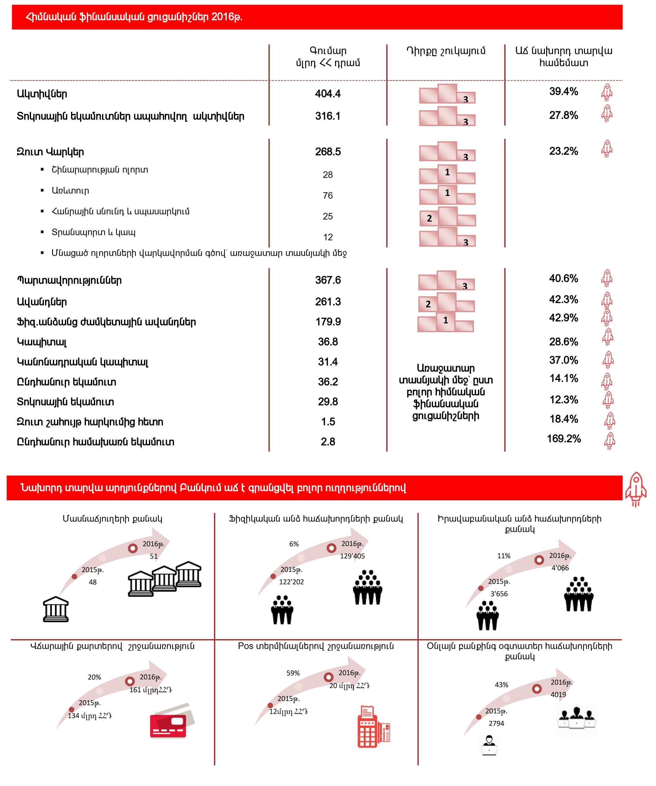 Հայբիզնեսբանկն ամփոփել է 2016թ. տարեկան արդյուքները՝ արձանագրելով աճ բոլոր հիմնական ֆինանսական ցուցանիշների գծով:Մասնավորապես, բանկի ակտիվները մեկ տարում աճել են 39,4%-ով, պարտավորությունները՝ 40,6%-ով, իսկ կապիտալը՝ 28,6%-ով՝ կազմելով համապատասխանաբար 404,4 մլրդ դրամ, 367,6 մլրդ դրամ եւ 36,8 մլրդ դրամ: Բանկը 2016թ. ստացել է 1,5 մլրդ դրամի շահույթ (աճ՝ 18,4%):Հայբիզնեսբանկը գրանցել է աճ նաեւ վարկերի (268,5 մլրդ դրամ, աճ՝ 23,2%) եւ ավանդների (261,3 մլրդ դրամ, աճ՝ 42,3%) մասով: «2016թ. արդյունքներով՝ Հայաստանի բանկային համակարգում ֆիզիկական անձանց ժամկետային ավանդների գծով (179,9 մլրդ դրամ, աճ՝ 42,9%) Հայբիզնեսբանկն առաջին տեղում է, ինչը վկայում է այն մասին, որ հաճախորդները մեզ վստահում են, եւ մենք պատրաստ ենք միշտ ապացուցել, որ դա իզուր չէ՝ պարբերաբար շուկային ներկայացնելով մրցունակ պայմաններով նոր ապրանքատեսակներ եւ նոր լոյալության ծրագրեր` հավատարիմ հաճախորդների համար»,- ասված է հաղորդագրությունում:Հիշեցնենք, որ Հայբիզնեսբանկը 2016թ. Հայաստանի 1000 խոշորագույն հարկատուների ցանկում զբաղեցրել էր 45-րդ տեղը՝ բյուջե վճարելով 2,7 մլրդ դրամ:Բանկի տարեկան ցուցանիշներն առավել մանրամասն արտացոլված են ստորեւ բերված գծապատկերում: Tweet Դիտում՝ 3089