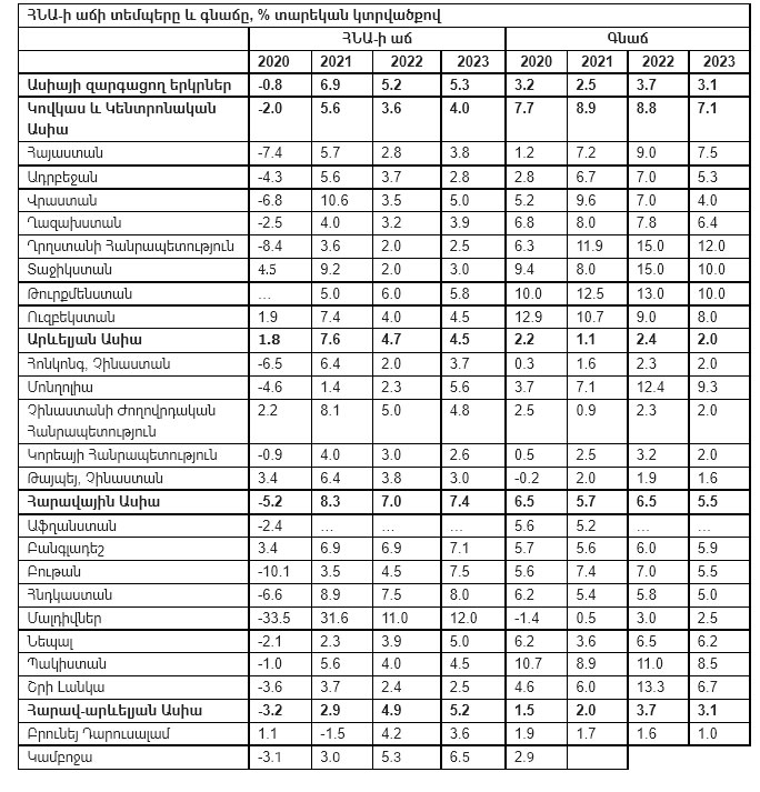 Աշխարհաքաղաքական զարգացումները մեծ անորոշության մեջ են թողնում տնտեսական հեռանկարները Հայաստանում եւ ներկայացնում աճի տեմպերի նվազեցման լուրջ ռիսկեր։Այս մասին ասված է Ասիական զարգացման բանկի (ԱԶԲ) այսօր հրապարակած 2022 թվականի Ասիական զարգացման հեռանկարներ (ԱԶՀ) ուսումնասիրության մեջ:«Եթե Ռուսաստանի նկատմամբ պատժամիջոցներից եկող հավելյալ կողմնակի ազդեցություններ չլինեն՝ 2022 թվականին կանխատեսվում է Հայաստանի տնտեսական աճի նվազում՝ 2021 թվականի 5.7%-ից մինչեւ 2.8%-ի։ Սպասվում է, որ տնտեսական ցնցումների ազդեցության թուլացման արդյունքում 2023 թվականին կրկին կարձանագրվի աճ, որը կկազմի 3.8%։ Սպասվում է բոլոր հիմնական ոլորտների չափավոր ընդլայնում։ Կանխատեսվում է 2022 թվականին գյուղատնտեսության ոլորտի աճ 2.5%-ով։ Միեւնույն ժամանակ, ըստ կանխատեսումների, 2022 թվականին գնաճի տեմպերը կավելանան՝ կազմելով առնվազն 9%, պայմանավորված համաշխարհային գների եւ կոմունալ ծառայությունների սակագների բարձրացումով, ինչից հետո՝ 2023 թվականին կնվազեն՝ 2023 թվականին կազմելով 7.5%»,- ասված է հաղորդագրության մեջ։Ուսումնասիրության մեջ նաեւ նշվում է, որ Ռուսաստանի ներխուժումն Ուկրաինա ամենալուրջ ռիսկն է Ասիայի զարգացող երկրների տնտեսական հեռանկարների համար։ Արդեն իսկ այս պատերազմը բացասաբար է անդրադառնում տարածաշրջանի երկրների վրա՝ արձանագրելով ապրանքների, զորօրինակ՝ նավթի գների կտրուկ աճ, եւ այն մեծացրել է անկայունությունը համաշխարհային ֆինանսական շուկաներում։ Քովիդ-19-ի ազդեցությունը շարունակվում է Ասիայի զարգացող երկրների տարբեր մասերում՝ որոշ երկրներում հիվանդության դեպքերի թվերի շոշափելի աճի դրսեւորումներ:Միաժամանակ, համաձայն ԱԶԲ կանխատեսման՝ Ասիայի զարգացող երկրների տնտեսություններն այս տարի կարձանագրեն 5.2%-ի, իսկ 2023 թվականին՝ 5.3%-ի աճ՝ պայմանավորված ներքին պահանջարկի սրընթաց վերականգնմամբ եւ արտահանման շարունակվող ընդլայնմամբ։ Tweet Դիտում՝ 3227