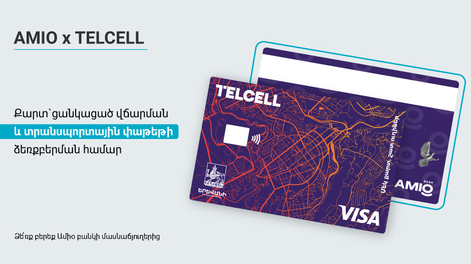 Amio x Telcell համատեղ Visa քարտը նախատեսված է ցանկացած վայրում վճարումների, ինչպես նաեւ տրանսպորտային փաթեթի ձեռքբերման համար։Երկար սպասված Amio x Telcell համատեղ Visa քարտը բազմաֆունկցիոնալ է․ քարտով հնարավոր է կատարել բանկային գործարքներ, գնումներ, կանխիկացում բանկոմատներից եւ գնել տրանսպորտային ուղետոմսերի փաթեթներ:Առավելություններ եւ պայմաններ.• Ամիօ բանկի cash-in բանկոմատներով եւ բանկի տարածքում տեղադրված վճարային տերմինալներով քարտը կարող ես համալրել անվճար,• Ամիօ բանկի տարածքից դուրս՝ Telcell Terminal-ներով քարտի համալրումը կատարվում է 100 դրամ միջնորդավճարով, իսկ Telcell Wallet հավելվածում՝ անվճար,• 14-ից 18 տարեկաններին քարտերը տրամադրվում են ծնողի համաձայնությամբ,• քարտի տարեկան սպասարկման վճար՝ 1000 դրամ:Amio x Telcell համատեղ Visa քարտը կարող եք պատվիրել Ամիօ բանկի ցանկացած մասնաճյուղում։Քարտի մասին մանրամասներն՝ այստեղ:Հարցերի դեպքում կարող եք զանգահարել Ամիօ բանկի զանգերի կենտրոն՝ (010) 592020։ Բանկը վերահսկվում է ՀՀ ԿԲ կողմից։ Tweet Դիտում՝ 3125