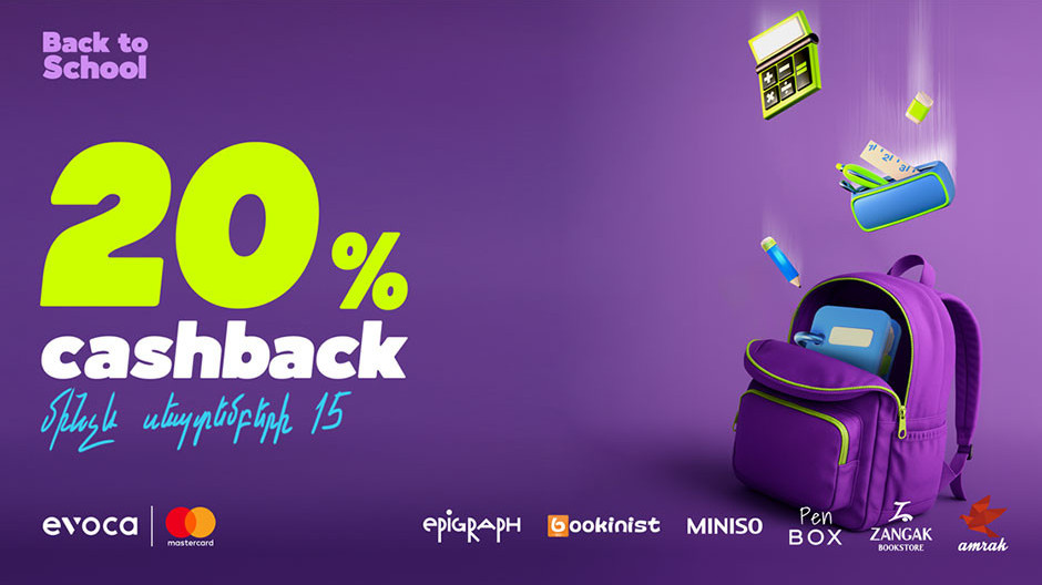 Սեպտեմբերը մոտենում է, եւ ճիշտ ժամանակն է՝ ուսումնական տարվան պատրաստվելու:Օգոստոսի 15-ից սեպտեմբերի 15-ը գրախանութներում Evoca Mastercard-ով վճարում կատարելով՝ կստանաք 20% cashback:Բանկից հայտնել են, որ որոշ խանութներում կավելանա նաեւ Evoca Benefits-ի շրջանակում ձեր ունեցած cashback-ը:Որտե՞ղ է գործում առաջարկը․• Pen Box – 20% + 5% Evoca Benefits Cashback• MINISO – 20% + 5% Evoca Benefits Cashback• Amrak – 20%• Zangak – 20%• Bookinist – 20%• Epigraph – 20%Առաջարկը գործում է Mastercard Standard, Mastercard Gold, Evoca Travel Card եւ Mastercard Digital քարտերի դեպքում։Cashback-ի առավելագույն չափ մեկ քարտին 10,000 դրամ է, այն կփոխանցվի ակցիայի ավարտից հետո 10 աշխատանքային օրվա ընթացքում։Առաջարկի մանրամասներին կարող եք ծանոթանալ այստեղ։Եթե դեռ չունեք Evoca Mastercard, պատվիրեք այստեղ եւ ստացեք անվճար առաքմամբ 3 օրում: Tweet Դիտում՝ 1890