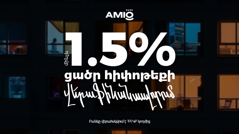Ամիօ բանկում Ձեր հիփոթեքը կարող է նվազել 1.5%-ով: Տեղափոխեք այն եւ վայելեք ավելի թեթեւ վճարումները:Բանկն առաջարկում է հիփոթեքային վարկերի վերաֆինանսավորում՝ ավելի շահավետ պայմաններով: Այս առաջարկը հնարավորություն է տալիս նվազեցնել գործող հիփոթեքային վարկի տոկոսադրույքը մինչեւ 1.5%-ով, ստանալ ֆինանսական ազատության նոր զգացողություն եւ օգտվել մի շարք առավելություններից:Ամիօ բանկում Ձեր հիփոթեքը դառնում է ավելի թեթեւ, քանի որ.• Վճարելու եք մինչեւ 1.5% ավելի ցածր տոկոսադրույք• Կարող եք երկարաձգել մարման ժամկետը եւ թեթեւացնել ամսական վճարումները• Վարկը տեղափոխվում է նաեւ առանց եկամտի վերլուծության• Նոտարական, կադաստրային եւ միասնական տեղեկանքի ծախսերը հոգում է բանկըԲանկն առաջարկում է նաեւ հավելյալ վարկային գիծ մինչեւ 8 միլիոն դրամի չափով՝ առանց նոր փաստաթղթերի ու միջնորդավճարների:Մանրամասներին ծանոթացեք այստեղ:Բանկը վերահսկվում է ՀՀ ԿԲ կողմից: Tweet Դիտում՝ 1822