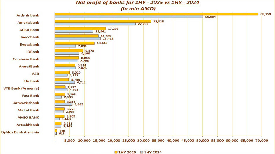 We are presenting to your attention the summary of the results of the Armenian banking sector for 1HY-2025, prepared and published exclusively on Banks.am by a specialized consulting company RUMELS Management Solutions.Ruben Melikyan has more than 25 years’ experience, as a successful c-level executive (CEO/CFO), with a successful track record leading diverse management teams in different areas, like audit, micro-finance, retail, FMCG and banking. Ruben Melikyan is an ACCA member; he graduated from Oxford University (EMBA) and received a Certificate on “Advanced Corporate Valuation” from NYU.The purpose of this study is to analyze the main financial indicators of the Armenian banking system in 1HY 2025.Net ProfitThe total net profit of all Armenian banks during 1HY 2025 is equal to 200,7 bln AMD, which is by 29 bln AMD, or by 16,6% more than it was recorded in 1HY 2024.The largest profit was recorded by Ardshinbank, amounting to 68,8 bln AMD. All banks registered a profit during the mentioned period. Image by: RUMELS Management Solutions Total loan portfolioThe total loan portfolio of the banking sector during 1HY 2025 increased by 10,3%.As of 30.06.2025, the total loan portfolio amounted to 6,925 bln AMD, and its share in total assets is 60%.The mentioned total loan portfolio includes retail and corporate loan portfolios. Image by: RUMELS Management Solutions The market share of 5 largest banks (Ameriabank, Ardshinbank, Acba bank, Amio bank and Inecobank) by total loan portfolio is 64,4%.Ameriabank has the largest market share - 21,1%. Image by: RUMELS Management Solutions BondsDuring 1HY 2025, the total balance of bonds issued by Armenian banks decreased by 42 bln AMD, or 8%.As of 30.06.2025, the total balance of issued bonds amounts to 466 bln AMD.13 out of 17 banks issued bonds. Image by: RUMELS Management Solutions Total EquityDuring 1HY 2025, the total equity of the Armenian banking sector increased by 183 bln AMD, or 10% and amounted to 1.960 bln AMD. This increase is mainly due to generated profit in 1HY 2025, amounting to 200,7 bln AMD, increase of share capital of Amio bank, amounting to 20 bln AMD, and paid dividends.In 1HY 2025, 8 banks paid dividends, amounting to 136,4 bln AMD:- Ardshinbank - 103 bln AMD (out of which 97,5 bln AMD was allocated to share capital, as common and preferred shares)- Inecobank - 8 bln AMD- IDBank - 7 bln AMD- Acba bank - 6,6 bln AMD- Converse Bank - 4,3 bln AMD- AraratBank - 4 bln AMD- Evocabank - 2,5 bln AMD- Armeconombank - 1 bln AMD Image by: RUMELS Management Solutions To learn more about the financial analyses for the mentioned and other periods, please follow this link. Tweet Views 11883