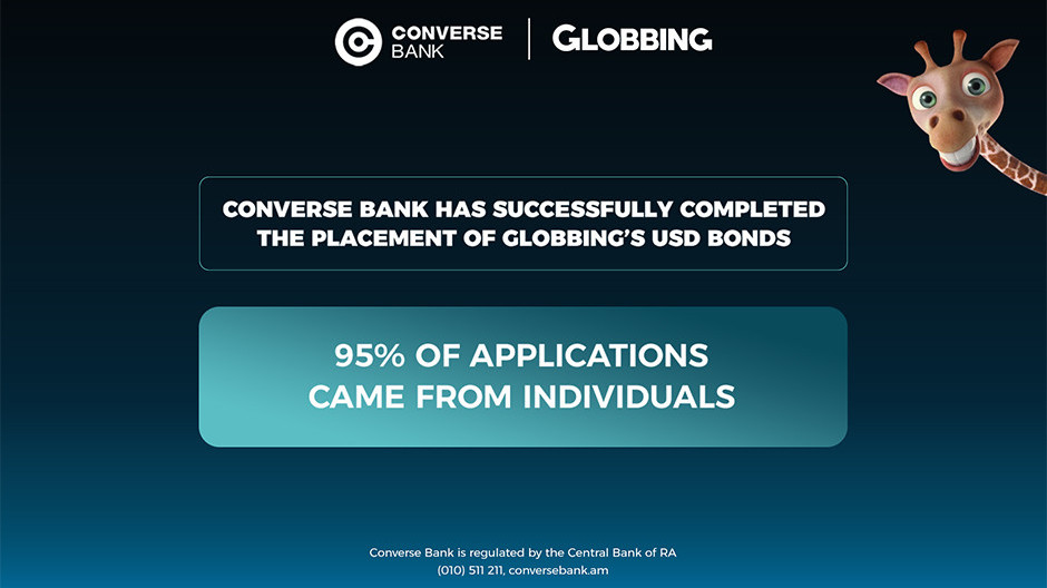Converse Bank announces the successful completion of the placement of Globbing bonds, reflecting “strong investor demand and confidence in the company’s financial position and growth strategy.”The bank reported that a total of USD 2 million in bonds was placed, offering an annual coupon of 8.25% and a maturity of three years. The placement was completed ahead of schedule, demonstrating strong interest from both institutional and retail investors. Approximately 95% of the issue was placed with retail investors, confirming broad market participation.The bonds will be listed on the Armenian Stock Exchange, providing transparency and secondary market liquidity for investors.The proceeds from the placement will be used to support business expansion, strengthen the company’s balance sheet, and finance its long-term development initiatives.Key terms of the bond issue:• Total volume: USD 2 million• Coupon rate: 8.25% per annum• Maturity: 3 years• Coupon payment frequency: semi-annual• Listing: Armenian Stock Exchange (in progress) Tweet Views 1661