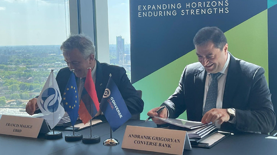 Converse Bank and the European Bank for Reconstruction and Development (EBRD) signed two loan agreements totaling US$ 8 million during the EBRD’s Annual Meeting in London.Converse Bank reported that of the total amount, the AMD equivalent of US$ 5 million will be allocated to financing investment projects of micro, small, and medium-sized enterprises (MSMEs) in Armenia through the EU4Business–EBRD Credit Line under the EU-supported SME Competitiveness and Inclusion Programme (SMECI). The remaining US$ 3 million will be directed toward financing green projects under the Green Economy Financing Facility (GEFF).It is noted that the SMECI Programme aims to support Armenian MSMEs in aligning their operations with best practices in product quality and environmental protection, while also promoting the adoption of green technologies. Under the programme, Converse Bank’s clients will benefit from EU-funded technical assistance and investment incentives in the form of grants of up to 15% of the loan principal.The programme also includes a special component targeting individuals displaced in Armenia between 2020 and 2023. In addition to the standard grant incentives, additional support will be available to refugee-owned businesses to help them re-establish their entrepreneurial activity, as well as to businesses that offer employment opportunities to displaced individuals.The GEFF Programme aims to support local businesses by boosting productivity and fostering sustainable economic growth through the adoption of innovative, energy-efficient technologies. Borrowers will also benefit from technical assistance and additional investment incentives to support the implementation of their projects, supported by the Green Climate Fund and Climate Investment Funds (CIF). The agreements were signed by Francis Malige, EBRD Managing Director for Financial Institutions, and Andranik Grigoryan, Chief Executive Officer of Converse Bank.“We greatly value our long-standing and effective cooperation with the EBRD. These new agreements will enable the bank to significantly expand access to finance for companies operating across various sectors of the Armenian economy, contributing to both business growth and overall economic development.I would particularly like to highlight the social impact of the SMECI Programme. Participating clients can benefit from grant support, with enhanced incentives available for companies engaging displaced individuals,” Andranik Grigoryan said.Francis Malige, EBRD Managing Director for Financial Institutions, also welcomed the continued partnership with Converse Bank: “The EBRD’s partnership with Converse Bank marks a significant step in enhancing the competitiveness of Armenia’s micro, small, and medium-sized enterprises. Backed by the support from our generous donors, this initiative aims to promote low-carbon practices and climate resilience. The funding is allocated to support investments in innovative green technologies, aligning them with EU standards. The EBRD will also provide incentive grants to MSMEs led by displaced individuals. This holistic approach fosters not only economic integration but also long-term benefits for the community. ”The programmes are expected to have a significant social and environmental impact by promoting the economic integration of displaced individuals and supporting green investments that contribute to the reduction of carbon emissions.Converse Bank is regulated by the Central Bank of RA. Tweet Views 4906