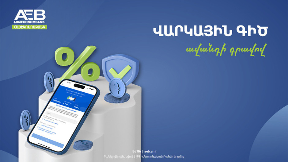 Armeconombank depositors have the opportunity to obtain a credit line in the currency of their fixed-term deposit (AMD, USD, EUR).The credit line is provided:• up to 95% of the deposit amount for AMD deposits, and up to 85% for foreign currency deposits,• with an annual effective interest rate of 8.56%–15.02%,• in the amount of AMD 100,000 to AMD 5,000,000.A credit line secured by deposit can be arranged via AEB Mobile without terminating the deposit agreement and while preserving the interest accrued on the deposit.Detailed information. Armeconombank is supervised by the Central Bank of Armenia. Tweet Views 5163