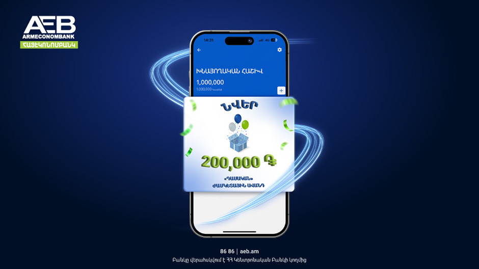 Armeconombank, encouraging the practice of saving wisely and emphasizing the stable financial future of its customers, offers to accumulate income in an AEB Mobile savings account with an annual return of up to 5% and take advantage of the opportunity to receive a term deposit as a gift from the Bank. From 1 August to 31 October of this year, by ensuring an average daily balance of at least AMD 1,000,000 in the AEB Mobile savings account, 10 (ten) customers of the Bank will have the opportunity to receive a gift - a term deposit in the amount of AMD 200,000.The winners will be selected by randomly through a random draw of 10 of the special codes among the eligible account holders.After the end of the campaign, until 15 December 2025, the winners of the contest must visit any branch of Armeconombank to place the gift, the "Classic" term deposit, under the currently applicable terms and conditions.The contest results, including winner codes will be published on social media platforms of Armeconombank, and the full information will be available on official website of the Bank.You can find general terms and details of Savings account of AEB Mobile here.Armeconombank is supervised by the Central Bank of Armenia. Tweet Views 4898