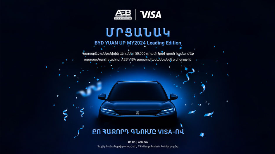 Armeconombank is offering its VISA cardholders the opportunity to win an electric car.From September 1, 2025 to October 31, 2025 by making non-cash purchases of AMD 50,000 or the equivalent in foreign currency with an AEB VISA card, customers can participate in the ruffle for a BYD YUAN UP MY2024 electric vehicle.“If you don’t yet have the AEB Mobile application, now is the perfect time to download it, order a free VISA Classic Digital card, and make your next purchase with VISA,” the bank said.All Armeconombank VISA cardholders are eligible to participate in the promotion.The campaign terms and other details are available here.Armeconombank is supervised by the Central Bank of Armenia. Tweet Views 6187