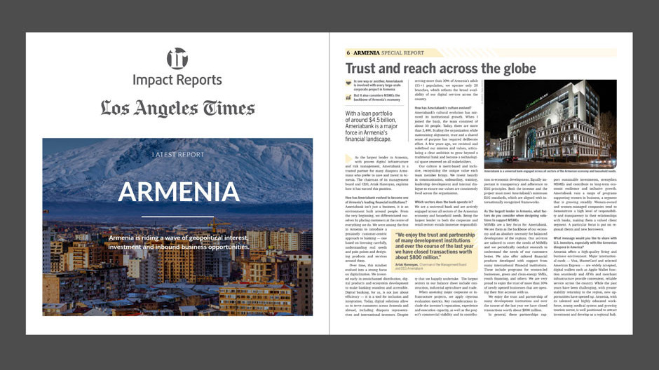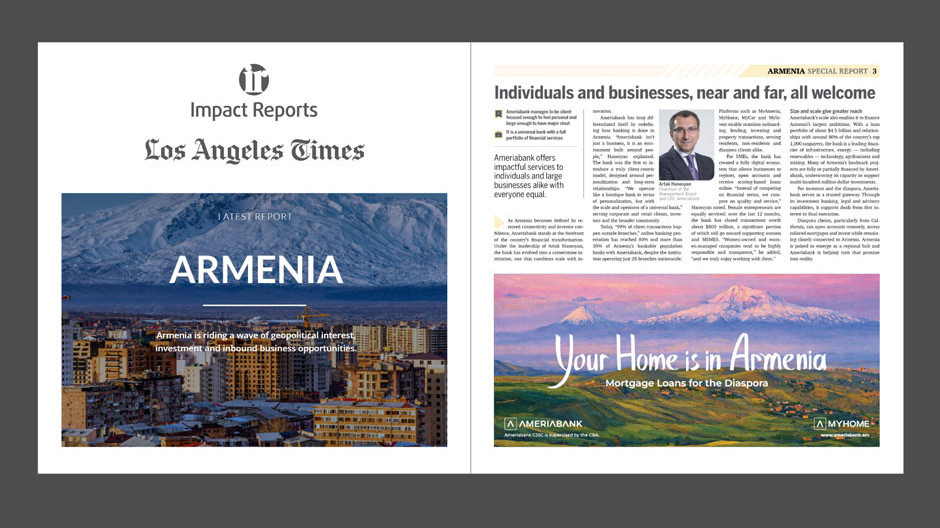 Америабанк представлен в докладе «Armenia Report 2026», подготовленном компанией Impact Reports и опубликованном в Los Angeles Times.Ниже представлены интервью с председателем директората-генеральным директором Америабанка Артаком Анесяном и статья о деятельности банка и его роли в экономике Армении.***Обладая кредитным портфелем в размере около 4,5 миллиардов долларов США, Америабанк является важной фигурой финансовой системы Армении.Будучи крупнейшим кредитором в Армении, обладающим развитой цифровой инфраструктурой и системой управления рисками, Америабанк является надежным партнером для многих армян Диаспоры, которые предпочитают хранить свои сбережения и осуществлять инвестиции в Армении. Председатель Директората-генеральный директор Артак Анесян рассказал о пути становления банка.- Как Америабанк стал одним из ведущих финансовых учреждений Армении? - Америабанк – это не просто бизнес, это среда, выстроенная вокруг людей, – отметил г-н Анесян. С самого начала мы отличались тем, что ставили клиентов в центр всего, что мы делаем. Мы одними из первых в Армении внедрили по-настоящему клиентоориентированный подход в банковском деле. Суть данного подхода состояла в умении внимательно слушать клиентов, понимать их реальные потребности, выявлять болевые точки и разрабатывать продукты и услуги, с учетом полученной информации. Со временем этот подход перерос в сфокусированность на цифровизации. Мы довольно рано начали инвестировать в омниканальную дистрибуцию, цифровые продукты и развитие экосистемы, чтобы сделать банковские услуги бесшовными и доступными. Для нас цифровой банкинг – это не просто повышение эффективности, это инструмент для обеспечения инклюзивности и интеграции. Сегодня цифровые решения позволяют нам обслуживать клиентов по всей Армении и за рубежом, включая представителей диаспоры и международных инвесторов. Несмотря на то, что мы обслуживаем более 30% взрослого населения Армении (старше 15 лет), у нас всего 28 филиалов, что говорит о широкой доступности наших цифровых услуг по всей стране.- Как развивалась культура Америабанка?- Развитие культуры Америабанка отражало его институциональный рост. Когда я начал работать в банке, команда состояла примерно из 30 человек. Сегодня их более 2400. Масштабирование организации, с одновременным сохранением согласованности, доверия и стремления к единой цели, потребовало немалых усилий. Несколько лет назад мы пересмотрели и переформулировали нашу миссию и ценности, четко обозначив стремление выйти за рамки традиционного банка и стать технологическим пространством для всех заинтересованных сторон.Наша культура основана на заслугах и принципе инклюзивности. Мы признаем уникальную ценность каждого члена команды. Мы вкладываем значительные средства в коммуникацию, адаптацию и обучение сотрудников, в развитие лидерских навыков и внутреннего диалога, чтобы обеспечить последовательное внедрение наших ценностей во всей организации.- Какие секторы охватывает деятельность банка?- Мы являемся универсальным банком и активно работаем во всех секторах экономики Армении, а также удовлетворяем потребности домохозяйств. Статус крупнейшего кредитора как корпоративного, так и розничного секторов влечет за собой огромную ответственность, которую мы с радостью принимаем. Наибольшую до